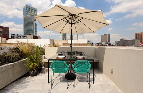 Experience the vibrant soul of Mexico City in our charming 1-bedroom duplex apartment. Step outside, and you'll find yourself amidst the cultural wonders of this historic district. Our rooftop terrace offers breathtaking views of the city, providing the perfect spot to relax after exploring nearby gems like La Ciudadela, the Mercado de San Juan, and the iconic Bellas Artes. Your urban retreat, filled with character and convenience.