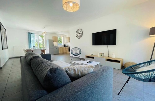 The living room also gives access, through a large glass door, to the garden of approximately 450m² where you will find everything you need to have a good time outside; table, chairs, deckchairs to enjoy the sun and of course the essential barbecue for summer or winter for the bravest.