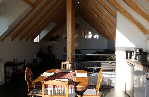 Located on the heights of the quiet village with a large terrace upstairs facing south, panoramic view of the Alsace plain, the black forest and the Swiss Alps.