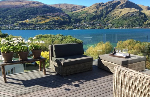 Nestled above Lake Wakatipu with private stairs down to the Lake's edge, this NEW listing is Five Star Guest-Reviewed Super Host Kaye Parker's own home. Kaye's Lakeside Retreat is luxuriously comfortable. Filled with art, books and all the creature comforts of home, together with personal design touches make it special. Absolutely everyone who walks through the front door is blown away by the stunning 180 degree views over the lake up to Coronet Peak ski field and the Crown mountain range. No photo can do the view justice. “The warmest, sunniest home in Queenstown in ANY season” is a comment made often by their guests. There are views over the lake and mountains from every room except the third bedroom which looks out onto the schist walled lawn, lavishly planted with white hydrangeas and roses.