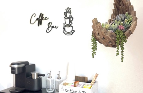 Inside, vaulted ceilings and big windows create a bright, open feel. Unwind in the cozy living room with smart TV, play games around the oversized coffee table, or gather in the dining nook for meals. The kitchen is fully equipped, and the stocked coffee bar—with syrups, teas, and a Keurig that froths milk—is perfect for slow mornings or post-lake pick-me-ups.