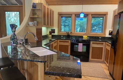 This Beautiful Lakehouse located on Little Woahink lake and just across the road from Woahink lake is one of the most scenic lakes in Oregon and they are sure to please the entire family. This gorgeous private home sits just above Little Woahink lake where you can swim, or enjoy your favorite non-motorized watercraft. After a day on the water relax in the hot tub or grill up your favorite meal with the gas grill on the expansive rear deck. Inside this wonderful home you will enjoy the fully stocked kitchen, a cozy family room with huge windows to enjoy the scenery, and books and games for those rainy nights. When it's time to turn in you will have two master suits to choose from, the first (bedroom #1) is a large suite with a king bed, a huge bathroom with a soaking tub, walk in shower, and private door to the rear deck. The second Master suite (bedroom #4) offers extra privacy located at the far end of the home above the garage with a private bathroom, a king bed, a futon couch that converts to a queen bed, and a private rear deck. The two additional bedrooms just off the main living space use a shared 1/2 bathroom, Bedroom #2 has a bunk bed with a pull out bed underneath giving you three twin beds and has a foosball table, bedroom #3 can also double as a sitting room and has a pull down Queen bed with a separate entrance.