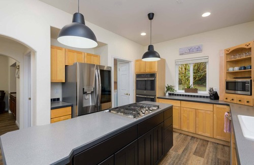 Gorgeous Lake area home located near one of Oregons most beautiful lakes. Designed with large families in mind, Huckleberry house offers a master suite with king bed and private bathroom with beautiful views. The second bedroom has a full / twin combination bunk bed, and then the third bedroom has a queen bed. Bedroom two and three share a full bathroom and are located on the second floor along with the master suite. In the Living room you will enjoy the huge rock fireplace with plenty of comfortable seating that includes a queen sleeper sofa. Step into the Den for a little extra privacy to read your favorite book or catch up on those emails, the Den also includes a queen box hid abed for your extra guests. You're sure to enjoy the large gourmet kitchen at mealtime with an attached dining room with views of the beautiful backyard. For our guests coming to enjoy the lake or sand dunes that may be towing their boat, dune buggy, side by side or ATV trailer, we have great turnaround driveway that easily accommodates small to medium trailers (about 20' max trailer length). A public boat launch located just off of Canary rd is only a few minute drive and dune access is located across Hwy 101 then west onto south Jetty rd.