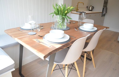 The Kitchen/Dining room is stylish and elegant providing comfortable seating for eight. All the equipment needed for a fully self-catered stay is available including an electric hob, microwave, electric oven and fridge freezer.