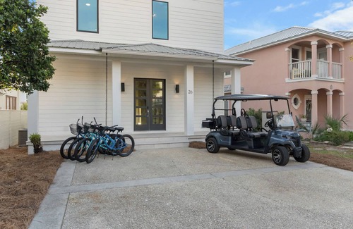 Getting around is easy and fun with six adult bikes and a six-seater golf cart included with your stay. Cruise down the Timpoochee Trail, a scenic bike path that connects all the charming towns along 30A, or take a short ride to Seaside for dining, shopping, and live music. With walkable beach access just steps from the back gate and most essentials just a few minutes away, you can park your car and enjoy the ride. Whether you're headed out for morning coffee, sunset cocktails, or a lazy beach day, everything is close and accessible.