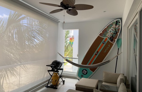 • Main Balcony: Overlooking the pool, featuring a sofa set, hammock, gas BBQ grill, ceiling fan, and a high bar table for a beach-like vibe. Includes an inflatable paddleboard for sea adventures.