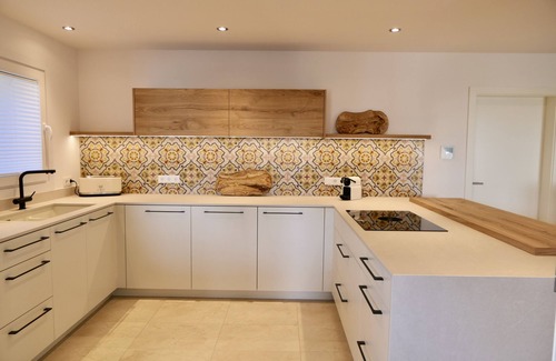 The modern German-made designer kitchen has its own window door, leading to the breakfast terrace, again with sea view