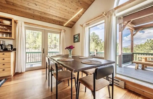 Backing up to over 2 million acres of national forest, this retreat with it's hot tub, woodburing stove, outdoor dining, grill, wrap around deck, endless mountain views, hammock, and private trail out the back door is the perfect setting for connecting with nature, reading a good book by the fire, being with family, or a romantic trip for two. This rare property offers 3 bedrooms & 2 full bathrooms-perfect for families or groups of friends, but just as special for just two to enjoy. We have thought through every detail from organic cotton linens, local coffee, to professionally designed interior - this property won’t disappoint. It also features an office area, ideal for those who need to balance work and play. Because this extra special property is located in dark sky country, at night one can see the Milky Way stretch across the entire sky. the house is minutes from gold medal fly fishing rivers, some of the best hiking in Colorado and will give you a real sense of retreating into nature. The property is only 1 hour from Colorado Springs, 2.5 from Denver, and about 2 from Breckenridge and it's world class skiing + snowmobiling. So come be surrounded by national forest, enjoy sunsets on the wrap around deck, enjoy all the stars while relaxing in the hot tub, and experience true relaxation.