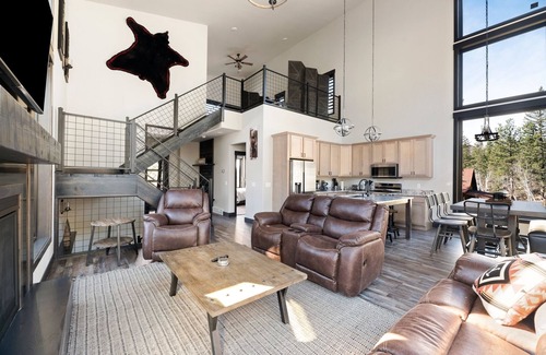 The main level Great Room has floor to ceiling windows, gas fireplace, and flatscreen tv. Guests will love the open kitchen and dining area with granite counters and brand new appliances.