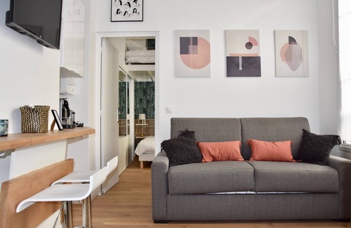 The kitchen is open to the dining area, equipped with an extendable dining table. The bathroom, renovated, has a shower, sink with mirror and a storage unit. This charming apartment is very well furnished in a contemporary spirit: you will find many works, paintings of Parisian artists as well as everything you will need during your stay: modern equipment (Nespresso machine, kettle, toaster ... ), very good bedding both beds and sofa bed. The apartment is quiet, bright and ideally located in the center of Paris.
