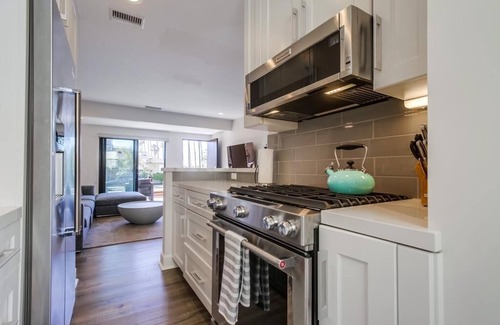 Enter into a light & bright space, with open floorplan concept. The living room is highlighted by our new oversized modern sofa & amazing LG OLED 65” mounted TV (the picture quality will not disappoint!).Off the living room are sliding glass doors that lead to your very own view patio that looks out onto the front grass lawn, as well as a built in dining nook. No expense spared on the kitchen, with sleek quartz countertops, white cabinetry, all new high end Kitchen Aid brand appliances, & access to your exclusive rear yard with beach gear & bbq.