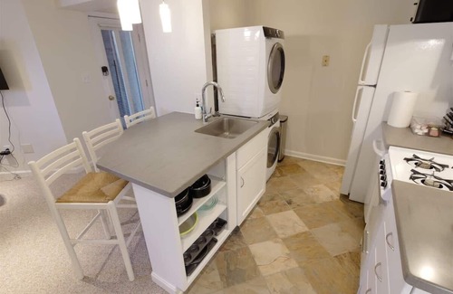 Acozy living room provides guests with a cozy refuge after a day of sightseeing; and with an open plan full kitchen, and conversational breakfast bar, the open living space is a perfect spot to plan the days activities. There is a dedicated desk space as well as additional laptop friendly workspaces (dining table, breakfast bar) plus great wifi and a brand new TV to stream your favorite shows!