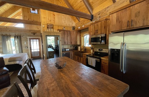 The Owl and Moon was designed and built to be a romantic getaway beginning from the ground up with the hand hewn logs set by master builder Brian Blancett. From the vaulted ceilings with a floor-to-ceiling stone log burning fireplace, to the dual windows that open to the sky and valley below, the customized views are unparalleled. The wraparound porch provides 360 degree views of beauty, the therapy hottub on the covered porch has views of the valley below, while the back porch has its own stone fireplace with gas logs. and seating area, swing and grilling area, all overlooking the valley for miles and miles. Outdoor firepit also has expansive views. A fully appointed kitchen with all modern appliances and copper tub with walk in shower will make you feel as cozy as an owl in its nest. Large back deck with steps to the brow below for exploring and all within a couple of miles from downtown Mentone Shops, restaurants, and farmers market. Bring your bike, there are miles of roads along the brow. High quality linens, towels, and bedding is provided, with a QLED 80 inch TV to watch the games, Wireless internet and a multitude of DVD titles and board games available for your use as well.