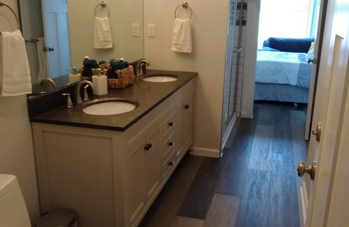 Prime waterfront studio with docking ability using mooring whips, less than a mile north of Wolfies. This is not a cheap renovation. This is a transformation. Private entrance, full kitchen with granite countertops and black stainless appliances, quartz double sink vanity, tiled w/glass door shower, queen bed, wifi, slingtv, all utilities included. Docking potential with waiver. Patio table and chair for outdoor dining. Coffee maker and blender for special drinks.