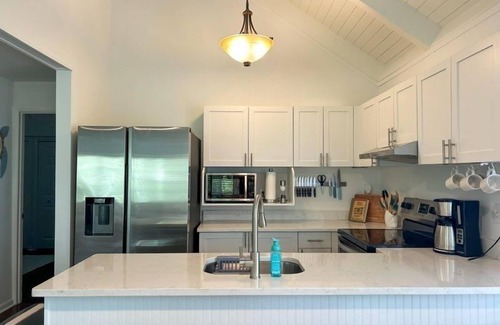 Inside the villa, guests will find a palette of crisp whites with colorful beach accents. The living area with elevated ceilings, ample plush seating, large screen TV, and ceiling fan is an ideal place to gather. There's even a desk area to work remotely. Off the living area, is a dining area that seats six. The open space flow seamlessly into a well stocked and clean kitchen.