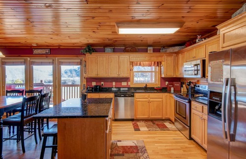 The house features: The two story Living Room has hardwood floors, comfortable leather furniture & a floor to ceiling stone fireplace. There is a large flat screen HDTV with a Premier Satellite package offering many HD channels plus local, movie & sports channels. There is a DVD player & a large library of videos for your viewing entertainment. The Living Room flows right into your kitchen & dining area. The large spacious kitchen has granite countertops, stainless steel appliances & is equipped with plenty of cookware & utensils to make cooking any meal a breeze. Your kids will enjoy sitting at the island helping you prepare dinner & there is plenty more seating once dinner is done for some great family quality time. If the weather is nice, grill up some burgers or steaks & enjoy dining outside on the covered deck while admiring the scenic view of the mountains, pastors & the river. There is also a outdoor checkerboard table. The King suite is located on the main level. There is a King bed, decorated in a bear motif & has a pillow top luxury mattress for a great night's sleep. On a cool summer night, open your windows in this peaceful, quiet area & enjoy snuggling under the mountain quilts. There is a large flat screen HDTV for catching a late night movie & the bedroom connects with a full bathroom. The laundry with full size washer & dryer is also on the main level. Upstairs you will find two bedrooms also nicely decorated with queen beds, luxury pillow top mattresses & quilts & their own flat screen HDTV. There is a large loft with plenty of windows with great scenic views of the river. You will find a queen bed & daybed with a trundle. There is also a second upstairs full bathroom with a tub.