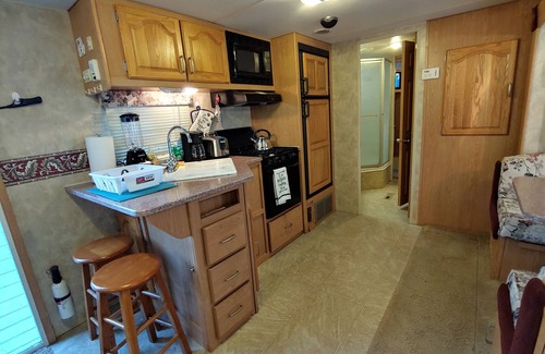 Best Deal in New Smyrna that sleeps up to 6. Hugh 75' X 10' Shared Pool. If you don't want to rent a Extra LARGE RV & then pay the $50/nite camp ground fees!!! this is your deal. Its my personal 2007 40' Fleetwood Prowler Travel Trailer in excellent condition fully, equipped , stocked & set up on my New Smyrna Beach property in a quiet area only 3.5 miles from New Smyrna's World Famous, Drive on Beach. It’s approx. 460 sq ft with 1 queen 4 bunkbeds and a pull out couch & all the comforts of home. Everything is included, stocked kitchen, 2- Smart TV's , WIFI, Shared washer & dryer, even a shared 2nd shower in garage if you need two showers. It has a Large 75’ X 10’ screened in pool/partial covered, refreshing pool, its slightly warmer then the seasonal NSB ocean temperature, which you have shared access to. along with the other current guests of the 3 other accommodations on property.