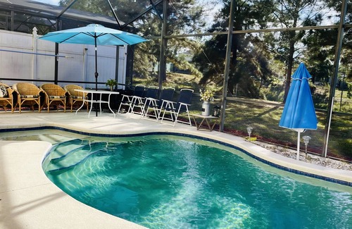 Let us dearly invite you to our new peaceful 2-story home with private screened pool overlooking green backyard, located near restaurants and shops, only minutes away from Disney World.