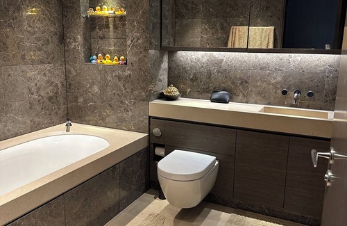 There is also a 3rd guest bathroom as well as a washer/dryer. The flat has perfect views for watching events such as the New Years Eve fireworks. There is a beautiful art collection and impeccable design.
