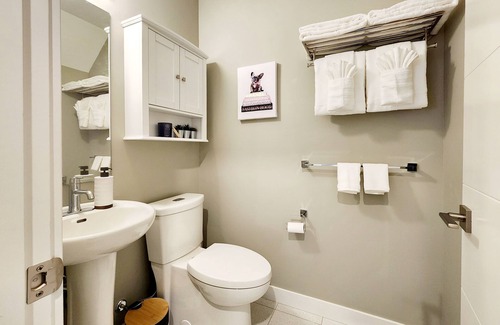 Fresh towels, shampoo, conditioner, and body wash are provided for your convenience.