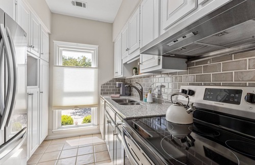 Enjoy our spacious townhome with fully equipped kitchen and bar seating, natural stone countertops, and stainless-steel appliances. Kitchen is stocked with coffee, tea, spices, oil and condiments. Expansive living room with oversized windows, blinds and curtains, 65" Smart TV and JBL blue tooth speaker. Stylish and comfortable furniture, private patio, sofa, gas grill, firepit with seating, string lights, fenced yard.