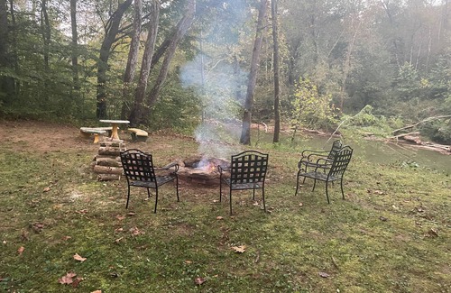 Nestled in the Daniel Boone National Forest, alongside the beautiful Rockcastle River, our lovely property offers a cozy retreat for guests. Located just 4 1/2 miles off I-75 at Exit 49, with a comfortable king bed and a queen bed, you'll have a restful night's sleep. Whether you are coming to go kayaking down the river, hit the trails 4-wheeling, hiking nearby, or simplify relaxing on the back deck, or sitting around the fire-pit, "River Run" is the place for you! The two bathrooms are equipped with everything you need, towels, washcloths, shampoo and soap, including a hair dryer. Master bath has walk-in shower, 2nd bath has a shower & tub. The kitchen has a dishwasher, microwave, coffee maker, and all the cooking essentials, a grill is located on the back deck. "Wildcat RV Park" is just a few miles south on Highway US25, and ATV riders are welcome w/fenced in secure parking and turn around area. Kayak rentals available nearby. Renfro Valley Entertainment Center is just a few miles north at Exit 62. 2 gate entrances, one for single vehicles, and for trucks & trailers. There is a security light located near the parking area in front of the home. Outdoor security camera's on the property.