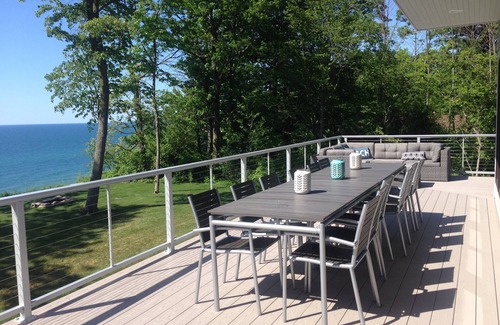 This stunning 3 level contemporary single family home was completed the end of 2015. Everything is new! House is located on a bluff with gorgeous views of Lake Michigan from virtually every room in the house. Property includes 200ft of private beach (NOTE: there are 225 stairs down to beach). 7 bedrooms (1 bunk room), 5 1/2 baths, 2 separate entertainment areas. Perfect for 2 or 3 families. Kitchen and main living area are on the 2nd floor with a HUGE wrap around deck with spectacular views. There are two 3rd floor Master suites with huge bathrooms and their own 3rd floor deck. Sunset viewing and fires on the beach a must!