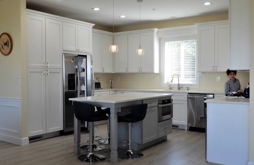 Master bedroom upstairs with King bed, ensuite bath, walk-in closet and private deck. Two Queen bedrooms (up and down) with ensuite bath, walk-in closets and private balconies. Children’s bedroom has bunk bed. Bedrooms are comfortably furnished with beautiful linens, pillows and bed coverings. Downstairs family area and dining room overlook the bay. Lower deck has large table for grilling meals on the water. Owner limits gatherings to total of 15 due to limited parking and neighborhood agreement.