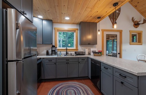 Come relax in this custom home situated in the western mountains of Maine. Enjoy woodsy views from every window while basking in the natural light. The open concept living space promotes togetherness while maintaining a cozy vibe. Watch a movie on the drop-down projector screen or cook in the well equipped kitchen or the outdoor bbq area. Keep away from the bugs relaxing in the screened in porch or watch the stars from the fire pit.