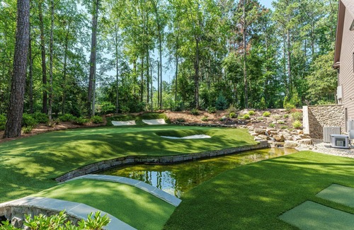 There are three bedrooms, one primary bedroom with a king bed and en-suite bathroom. The en-suite includes a walk-in shower and double vanity. The other two bedrooms feature queen beds and share a bathroom with tub/shower combo and single vanity. There is a dining room with seating for 6 guests and laundry facilities. A full kitchen is stocked with essentials and opens to the living room. The living room opens up to a covered patio with outdoor fireplace, outdoor living furniture, and outdoor dining for 6. There is also a half-bath located off of the patio. The pool/spa overlooks Lake Thurmond and has outdoor seating as well. The golf area is adjacent to the outdoor living space. The pickle ball court is located on the driveway. If you wish to use, staff will need to be notified prior to your arrival and you will need to park in the pull-in in front of the main home.