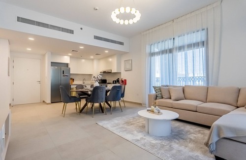 Spacious and stylish 2-bedroom apartment located in Madinat Jumeirah Living. This apartment will amaze you with its beauty and comfort as the bedrooms are thoughtfully designed with high quality furniture and bed settings. The apartment reflects a tone of modernity and comfort. The bathrooms are filled with toiletries and storage facilities. The kitchen is fully equipped with all the appliances, refrigerator, microwave, dishwasher, oven, washing machine, dishes/cutlery, kitchen utensils, coffee machine, toaster, kettle, vacuum etc. .The living room is well put together with a modern twist and a classic look, with a large sofa, smart TV and dining area overseeing beautiful views of the nature & the Burj Al Arab. The home is always professionally cleaned and strategically sanitized for your safety. The apartment is very cozy, spacious, and ready to move in.