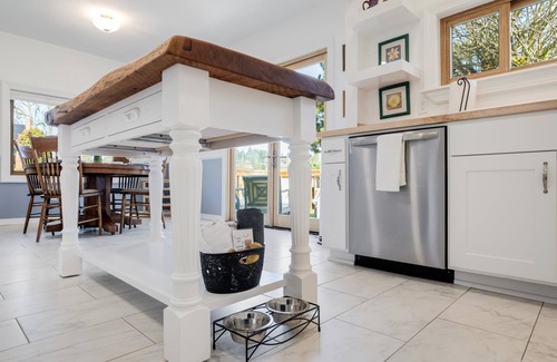 This beautifully remodeled and smartly laid-out home has a stunning kitchen with new floors, cabinets, sink, stove, and appliances. There is a large island made from reclaimed wood from the original kitchen. Perfect for making memorable home-cooked meals and warmly crafted dishes. You will find the home well stocked to prepare a full meal or to bring in some tasty local takeout.