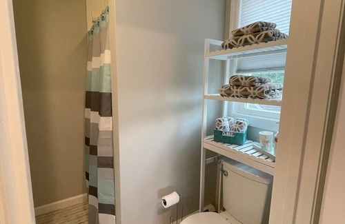 The first-floor of our home offers an open kitchen/dining room which can sit up to 9 people for a family meal. The kitchen is fully equipped with a refrigerator (water & ice), stove/oven, microwave, dishwasher, Keurig coffee/cappuccino/latte maker, blender, and toaster. There are plenty of cooking utensils, pots, pans and of course a variety of spices. It is a perfect place to enjoy a true North Fork farm to table experience. The living room is equipped with a recliner, reclining sofa, electric fireplace, ceiling fan, PlayStation 3 and a 75” Smart TV. There is also a powder room and full laundry on the first floor.