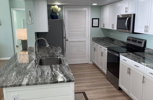 Now for the details... We have completely renovated the condo with all new flooring throughout, new cabinetry and vanities including new countertops, fixtures, and sinks in the kitchen and both bathrooms. We replaced all appliances with new ones -refrigerator, dishwasher, oven, stove, microwave, washer, dryer, and water heater. We replaced the ceilings and lighting in both bathrooms and installed a new master walk-in shower with new fixtures. We continue to update our photos so please check back often as we continue to update our condo with new furniture, bedding, and accessories.