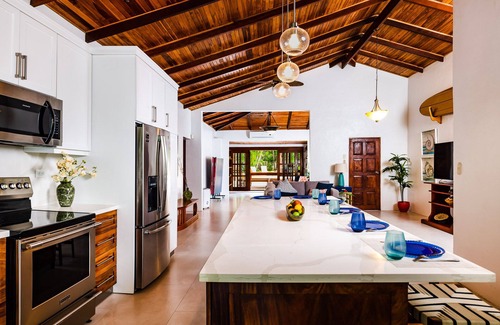 This casa is the perfect getaway to relax and enjoy the warm breezes of the Costa Rican coast. The neighborhood of Palm Beach Estates is a quiet, gated community with onsite security, located within the lush Las Baulas national marine park. The peaceful, uncrowded beach of Playa Grande is covered with beautiful shells just waiting to be discovered. And if you enjoy wave riding, our beach has one of the best surf breaks in the country! Casa Amigos is a spacious, uniquely designed property that was recently renovated to maximize the vacation experience for larger groups. The house boasts several living spaces for multiple activities yet maintains an open, interactive floorplan for the ease of group entertainment. Its two separate living rooms, centered in the house, provide a television with DVD player, plus a speaker. These rooms flow to the fully equipped kitchen, so you may curl up on one of several couches while other group members cook dinner or watch a movie.