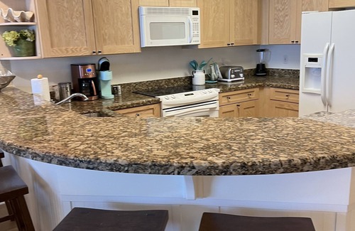 Stay in after a day at the pool and beach with a fully-equipped kitchen, 65 in. Samsung smart TV, and patio with rocking chairs for watching sunsets and relaxing to the sounds and views of the Gulf. Please note: NO sofa bed; maximum occupancy is 4 adults, 6 people total. NO smoking inside. NO pets. Any evidence of pets will result in loss of damage deposit.