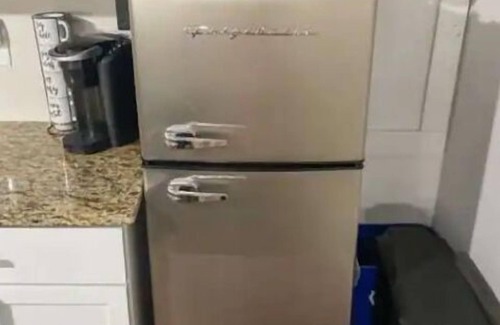 5 ft tall refrigerator/freezer with filtered Brita & ice trey, kitchen sink, utensils, dinnerware, pots & pans, 2 plug in countertop burners, toaster oven/air fryer, microwave, basic seasonings, olive oil/cooking spray, kettle, soaps, sponges, dish towels, paper towels, & single cup Keurig.