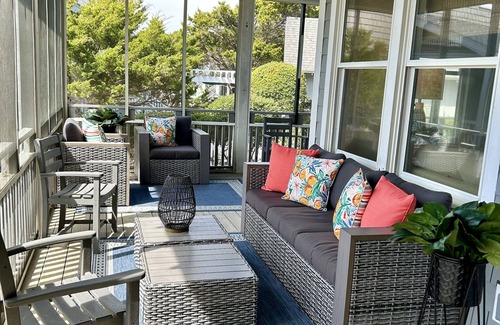 The beach is right across the cul-de-sac with access through a public walkway. Everyone can congregate around the kitchen bar, large dining room table or relax on the comfortable sofas and watch some television. The kitchen is fully equipped with enough utensils, cookware and dishes to make you feel right at home. A large screened in porch with plenty of seating is the perfect spot to relax and feel the ocean breeze.