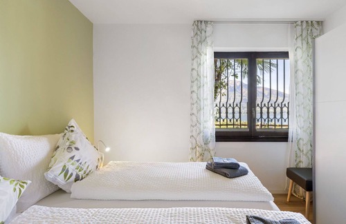 "Ramarro Lakeview", 2-room apartment 55 m2, south-east facing position. Object suitable for 2 adults + 1 child. Spacious and bright, comfortable and cosy furnishings: open living/dining room with 1 sofabed (140 cm, length 190 cm), open-hearth fireplace, cable TV and international TV channels (flat screen). Exit to the garden. 1 double bedroom with 1 double bed (2 x 80 cm, length 200 cm). Open kitchen (oven, dishwasher, 4 ceramic glass hob hotplates, toaster, kettle, electric coffee machine, Capsules for coffee machine (cicco d'oro (coop)) extra) with dining table. Shower/WC. Heating, floor heating. Large patio partly roofed, east facing position and south facing position. Terrace furniture, electric barbecue, deck chairs (2). Panoramic view of the lake, the mountains and the countryside. Facilities: washing machine, iron, mosquito net, children's high chair, baby cot for up to 2 year olds, hair dryer. Internet (WiFi, free). Please note: non-smokers only. Pellet hot air fireplace. NL-00001817