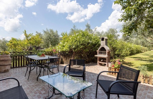 Just 13km from the sea, in Santo Stefano di Magra, this holiday apartment is located in a two-family house from the late 19th century. The house is located on the border to the famous Cinque Terre and the fashionable Versilia. The apartment is on the ground floor of a farm surrounded by olive trees (the owner produces wine and oil on the other side of the house, where the fields and a warehouse are located) and has its own entrance. The exclusive outdoor area is partially fenced and equipped for outdoor dining, with a shared play area. The location is ideal for exploring the nearby beaches, such as: Bocca di Magra (16 km), Ameglia (18 km) and Marinella di Sarzana (12 km). From the village you can take the train to the Cinque Terre. Portovenere (26 km), the pearl of Liguria, is unmissable. The Regional Park of Montemarcello (20 km) is an absolute must for trekking lovers and offers incredible views, as is the Park of the Apuan Alps with Colonnata (34 km), famous for the Lardo di Colonnata bacon. For city lovers, the old harbour town of La Spezia is just 12 km away. Lucca, with its imposing intact city walls, is 69 km away. You can buy good Ligurian olive oil locally. The last 200 metres of the access road are unpaved. Please note: From the house you can hear the sound of a motorway 150 m away as the crow flies, hidden by vegetation.