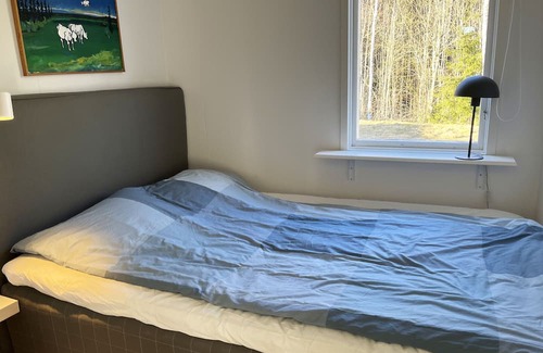 Cozy living room with fireplace in an open floorplan with the kitchen which is fully equipped. From the living room you go out to the large partially covered balcony, which is furnished with a dining area and sun loungers. Here you can spend warm summer days and enjoy the sun and have cozy barbecue evenings. There are two bedrooms, one of which has a queen-size bed of 140 cm and the other a bunk bed where the lower bed is 120 cm and the upper one 80 cm. Nice and fresh bathroom. Large and nice garden for play and ball games.