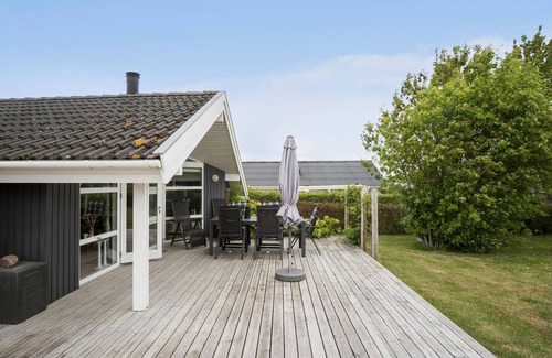 With a beautiful, large wooden terrace around the house awaits you this vacation home at the beautiful Sandager Næs. In the living room / kitchen area there are large windows overlooking the terrace, there is also a cozy fireplace and dining table. The house also has three good bedrooms and a bathroom.