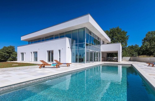 Fabulous Villa Koko on the outskirts of Rovinjsko Selo, a small town near Rovinj, is the ideal vacation home for up to 12 guests looking for pure relaxation and comfort. The villa has a spacious garden with a large private pool, 12 comfortable sun loungers and a covered dining area with a charcoal grill, ideal for al fresco dining on sunny days. The 600 m2 interior is divided over two floors and consists of a total of 6 bedrooms, each with its own bathroom and air conditioning. 5 bedrooms are located on the first floor and one on the upper floor. The fully equipped kitchen with dining area and the living room are located on the upper floor, which allows a wonderful view of the surroundings and the sea. Large glass surfaces provide natural light in the interior, which is simply but luxuriously furnished. For more relaxing moments, there is a large indoor jacuzzi and a sauna. For additional entertainment, the villa has an air-conditioned cinema room equipped with a large, spacious couch with reclining and seating areas. The 75-inch smart TV with high-quality picture and surround speakers enhances the realistic feel of each movie. Together with hot popcorn from the vending machine in the movie theater, entertainment is guaranteed! Villa Koko offers everything for a carefree vacation in the privacy of your own paradise, while all amenities such as restaurants and supermarkets are within walking distance. The Lim Bay is only a short drive away, as is the romantic town of Rovinj and the surrounding beaches. This villa is located in an idyllic landscape in the small village of Rovinjsko selo, a quiet suburb of Rovinj. Characteristic for this place are the traditionally built stone houses as well as the beautiful green of the fields, vineyards and surrounding forests. The great location of the suburb is ideal for daily exploration of the old town of Rovinj and its unique charm. Feel the magic of the town in the narrow medieval streets and warm Mediterranean surroundings. From the Church of St. Euphemia, where the most beautiful view of the town awaits you. Visit other sights such as the castle on the island of St. Andrija, the Franciscan monastery and the town walls. Rovinj is one of the most romantic towns in Croatia with beautiful sunsets that will take your breath away. However, the surrounding area offers numerous leisure activities: Cycling, horseback riding, jogging...