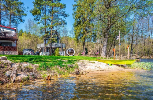 Enjoy the sun on beautiful summer days on the lakefront property. It offers a lot of space to play and relax. Refresh yourself in the cool water whenever you feel like it, or row out on the lake and try your luck with fishing. Later, gather the whole family for barbecue treats and end the day with a soothing dip in the hot tub.
