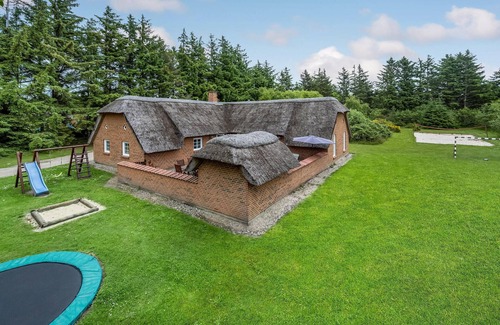 The cozy cottage with thatched roof and pool awaits you on a 5000 m² natural plot. In the garden you have space for games, soccer and more. The house is located in a quiet area, not far from the North Sea. The area invites you to go hiking and cycling. In the house there is also room for a large family to relax or be active. There are 6 bedrooms, 3 bathrooms and the pool area has a whirlpool and sauna as well. The large eat-in kitchen is an excellent gathering place. You'll be really cozy by the wood-burning stove, which will keep you in a good mood even on chilly evenings. The large, sheltered terrace accommodates garden furniture. Husby is perfect for nature lovers, there is a hiking area, a swimming lake, sea and dunes. The summer active resort of Søndervig is only 20 km away (bowling center, fitness center, stores, supermarket, restaurants). In the other direction, 12 km away is Thorsminde, an old fishing village. Take the fishing equipment with you, here the fish bite well.