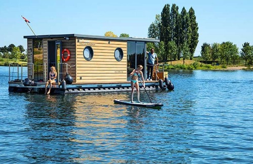 Experience the unique feeling of freedom that sailing with your own houseboat gives. This houseboat offers a 2+2 sleeping option. In addition to the kitchen with a sofa bed, the houseboat has a separate bedroom with a double bed and a high-quality bathroom with a regular hot water shower. This houseboat offers an optimal experience. Enjoy the view of the water, have dinner on the deck with a bottle of wine, or read your favorite book on the sundeck. Romantic as a couple, with friends, or with the whole family. You will look back on this holiday with great pleasure for a long time to come. The home port, marina De Spaanjerd on the border of the Netherlands and Belgium, is located 5 km from the white town of Thorn, 15 km from Roermond, and is connected to large ponds where numerous water sports can be practiced. To make sailing away and mooring a lot easier, the Comfort Class M has a bow thruster. Due to its good insulation, the comfort class M houseboat is also very suitable for renting in the winter. With the heating, it is pleasantly warm even on cooler evenings, so nothing stands in the way of a pleasant evening of games or reading! The kitchen on board has all the necessary kitchen appliances; a refrigerator, sink, and gas stove. A wonderful place to enjoy (nature) is the cozy lounge on the bow terrace. But even on days with bad weather, you can explore the idyllic Meuse valley, because the rudder is inside. Sailing is not mandatory but a nice extra. The costs of the sailing package incl. the sailing training of approximately 1 hour are 90 Euro, deposit for sailing 500 Euro. Due to possible damage to the deck and for your safety, only boat or sports shoes may be worn on a houseboat.