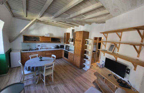 - A living area with a large kitchen including an oven, microwave, fridge and freezer, ceramic hob, capsule coffee maker, kettle, dishwasher, and washing machine. The living room features a corner sofa bed, a side table, an Android TV (with Arte Replay and France TV apps installed), internet with Wi-Fi, etc.