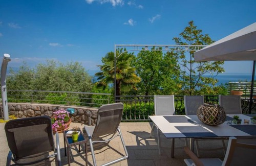 Semi-detached house "Nikolina". Above Lovran 2 km from the centre of Lovran, 7 km from the centre of Opatija, in a quiet, sunny, elevated position, 2 km from the sea, 2 km from the beach, in a cul-de-sac, in the countryside. For shared use: property 3'000 m2, lawn 1'000 m2, plants. Private: terrace (25 m2), garden furniture (swing). In the house: internet access, washing machine. Roofed, parking (for 2 cars) at the house on the premises. Shop 1.2 km, restaurant 1.8 km, bus stop 450 m, pebble beach 2 km, public bathing area 2 km, concrete beach 2 km.