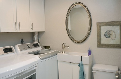 THE CONDO - This wonderful 2 bedroom, 2 and 1/2 bath condo can sleep up to six guests. Downstairs, you will find a fully equipped kitchen, as well as a half bath with a FULL-SIZED washer / dryer. In the living room, the entertainment center includes a large "smart" flat screen TV which gives you access to Netflix, Amazon, Hulu and more. A workstation gives you an area to set up your laptop and connect to Wi-Fi. A generous supply of games and books are available if you need some downtime after a busy day at the beach. Put your feet up and relax on the comfortable couch which can double as a sofa bed.