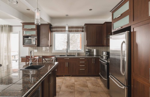 Escape to a spacious chalet with a hot tub, offering access to a lake, a central wood-burning fireplace, and accommodation for up to 10 people. Nestled between the lake and the mountains, it’s perfect for a family or friends’ getaway, just 5 minutes from Le Relais Ski Resort, 2 minutes from Sentiers du Moulin, and 25 minutes from Old Quebec City. Gather around our large kitchen with an island, ideal for sharing meals and creating unforgettable memories.